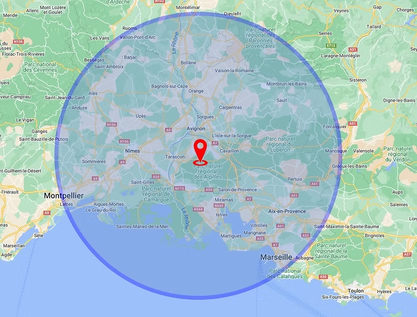 Nous couvrons toutes les villes et villages situées dans la surface en bleu, visible sur la carte ci-dessous.